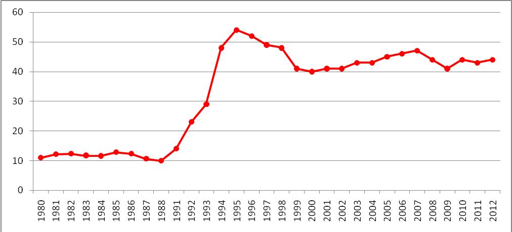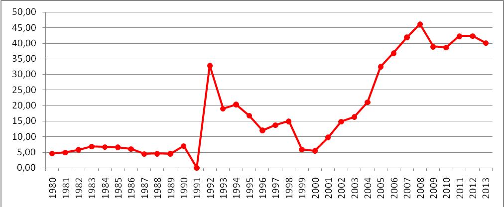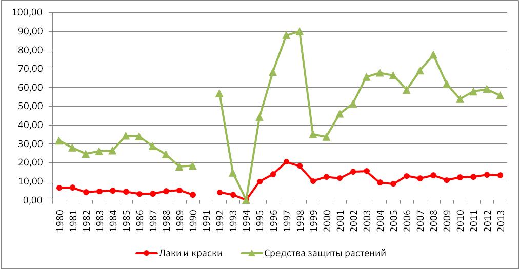 Примечание: точные данные по товарным ресурсам за 1989-2004, 2006-2009 отсутствуют. Период 1980-1988 характеризует СССР в целом, 1991-2012 – характеризует импортозависимость РФ.
