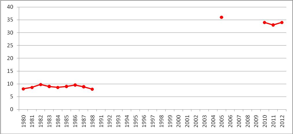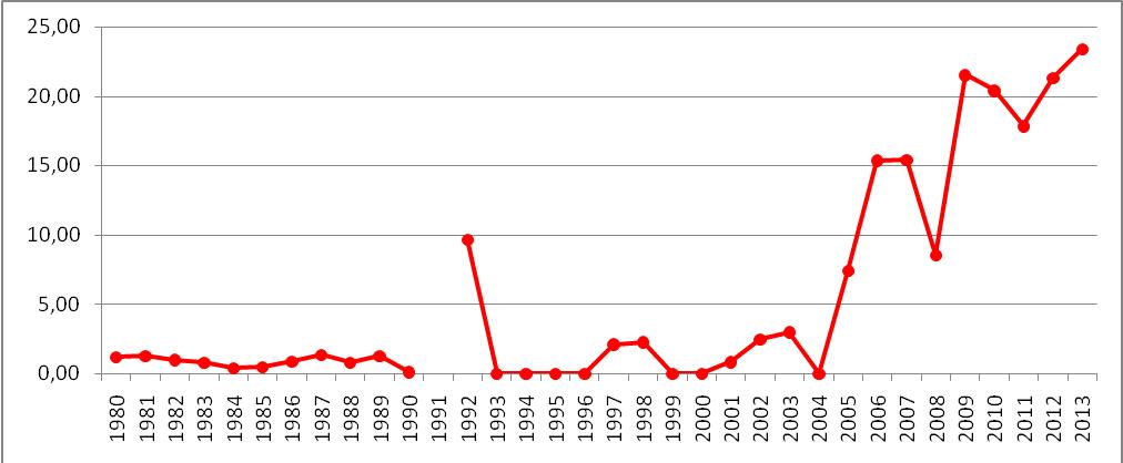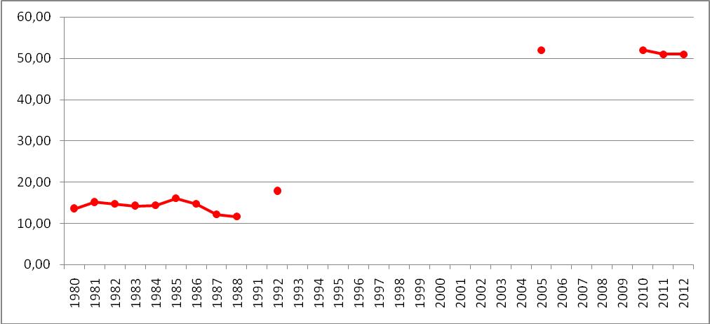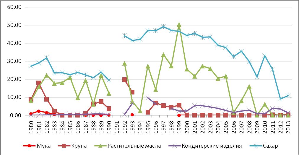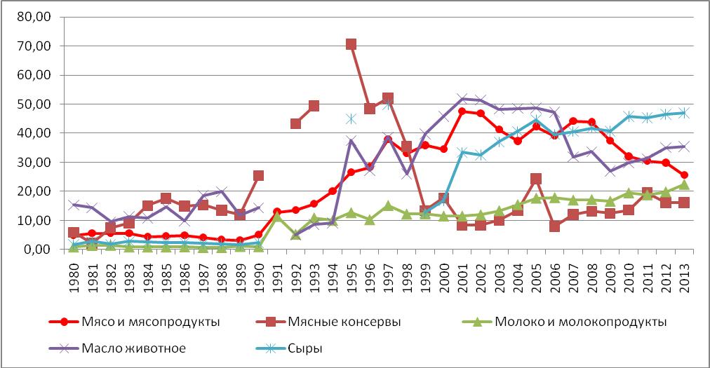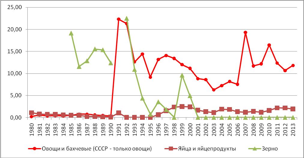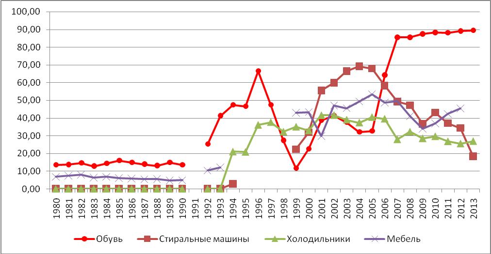 Графики построены только для тех товаров, для которых существующие статистические данные позволяют построить непрерывный временной ряд (с возможными редкими пропусками). Период 1980-1990 характеризует СССР в целом, 1991-2012 – характеризует импортозависимость РФ.