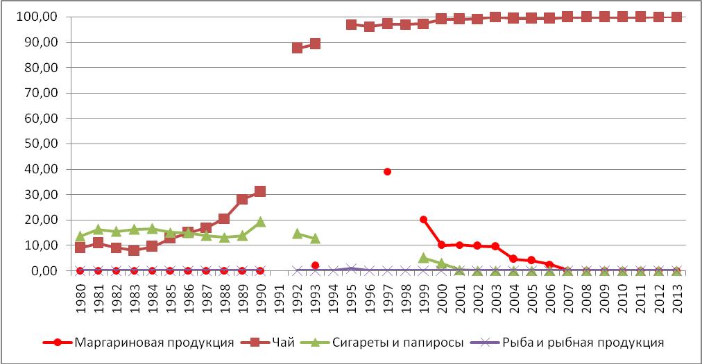 Рисунок 6 – маргариновая продукция, чай, сигареты и папиросы, рыба и рыбная продукция. Импортозависимость, %.