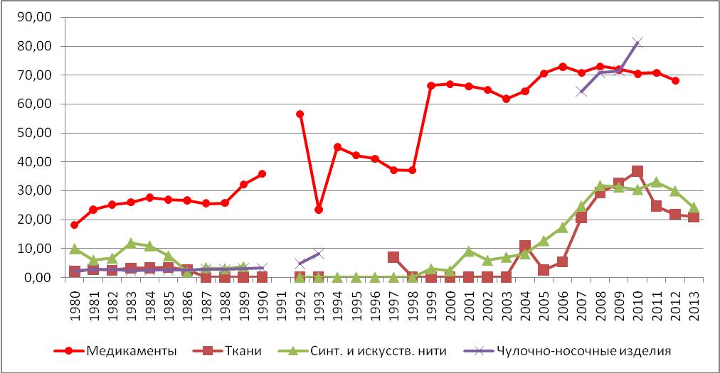 Рисунок 9 –медикаменты, ткани, синтетические и искусственные нити, чулочно-носочные изделия. Импортозависимость, %.