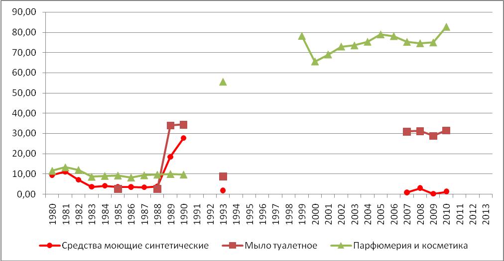 Рисунок 10 – средства моющие синтетические, туалетное мыло, парфюмерия и косметика. Импортозависимость, %.