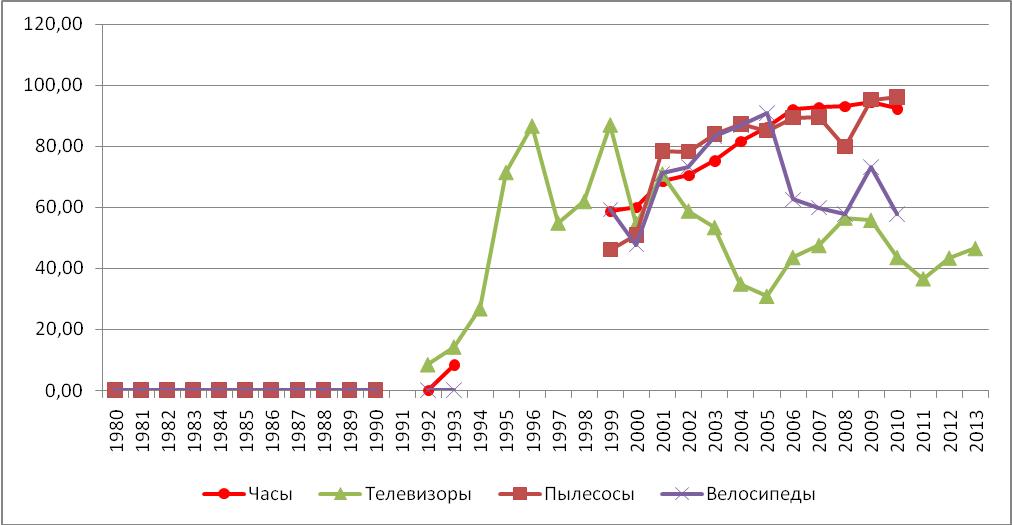 Рисунок 11 – часы, телевизоры, пылесосы, велосипеды. Импортозависимость, %.