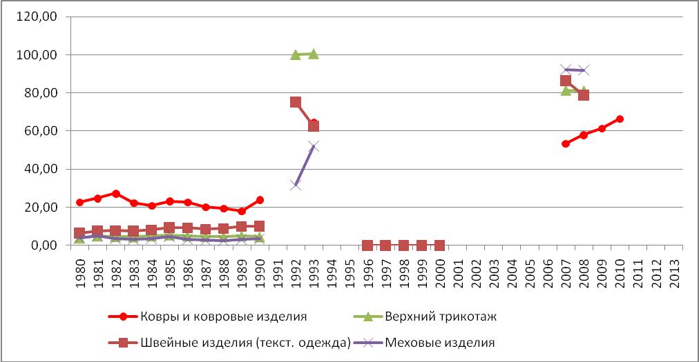 Рисунок 12 – ковры и ковровые изделия, верхний трикотаж, швейные изделия (иногда идёт замена показателя на текстильную одежду), меха и меховые изделия. Импортозависимость, %.