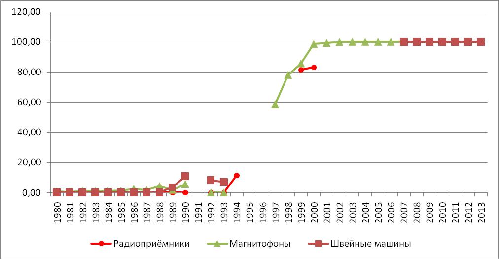 Рисунок 13 – радиоприёмники, магнитофоны, швейные машины. Импортозависимость, %.