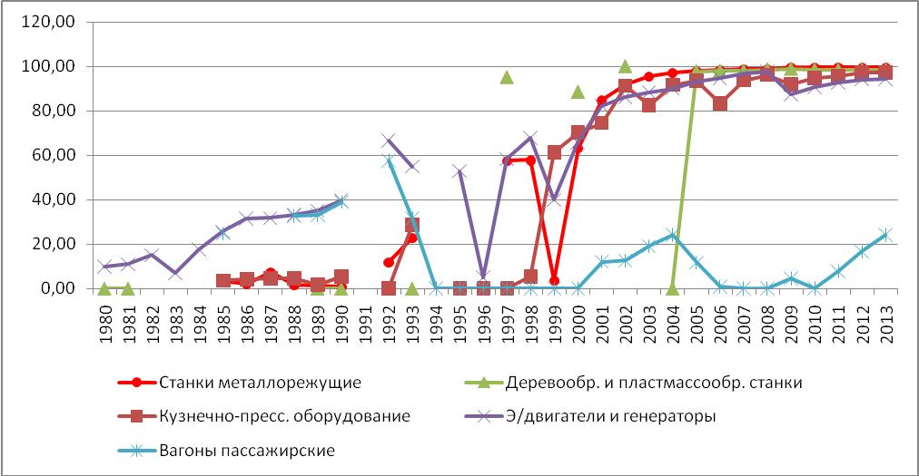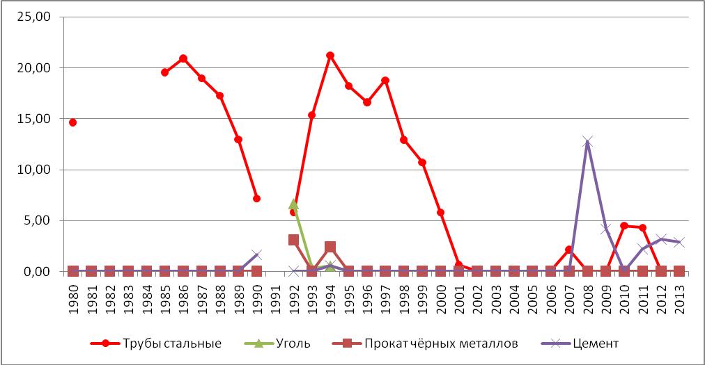 Подробные временные ряды импортозависимости 1980-2013 по отдельным товарам.