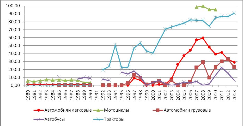 Рисунок 16 – транспортные средства и тракторы. Импортозависимость, %.
